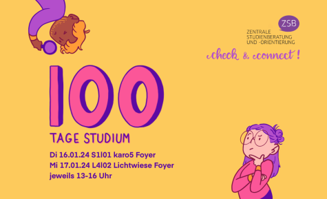 Dear first semester students, We would like to invite you to our event “100 days of studying: Check&Connect” so that you don't lose track. Here you will get to connect with the various contact points that will support you during your studies. From questions about the further course of your studies and tips on academic work to financing issues or help in immediate crises – we will shed light on the darkness and show you where you can find the best resources to make your academic journey a success.