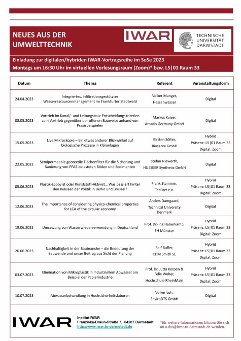 Unsere Ringvorlesung präsentiert aktuelle Forschungsfragen, relevante Fachthemen und methodische Lösungsansätze für komplexe Umweltprobleme. Wir laden externe Fachexperten ein, um über Themen wie Circular Economy, Abwassertechnik und Wasserversorgung zu referieren.